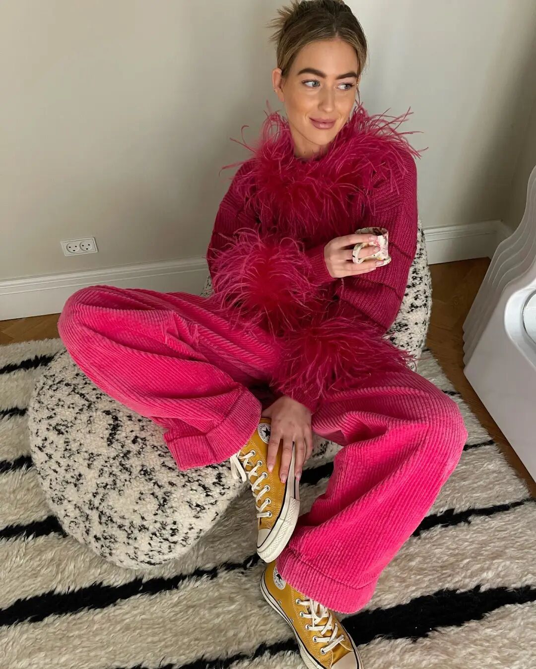 洋红色卫衣 + 短裤,最近有度假计划的朋友们,可以准备一套。