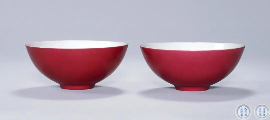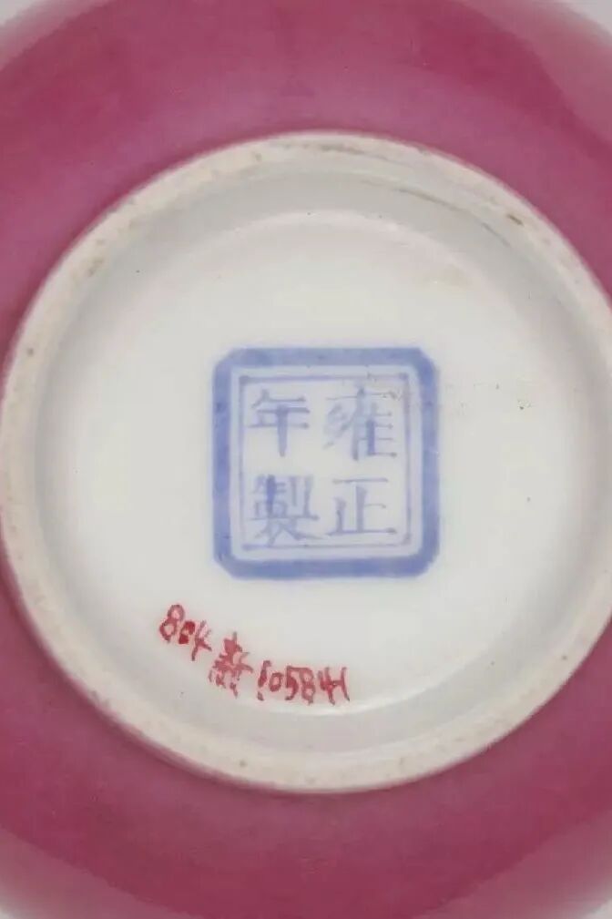 “胭脂红釉” 深受 “四爷” 雍正皇帝青睐与关注,在他的督促下到达烧造顶峰。制品多为小型碗、盘、杯、碟等制品,呈色由深及浅,浅者为“胭脂水”,浓者为“胭脂紫”,各具风姿。