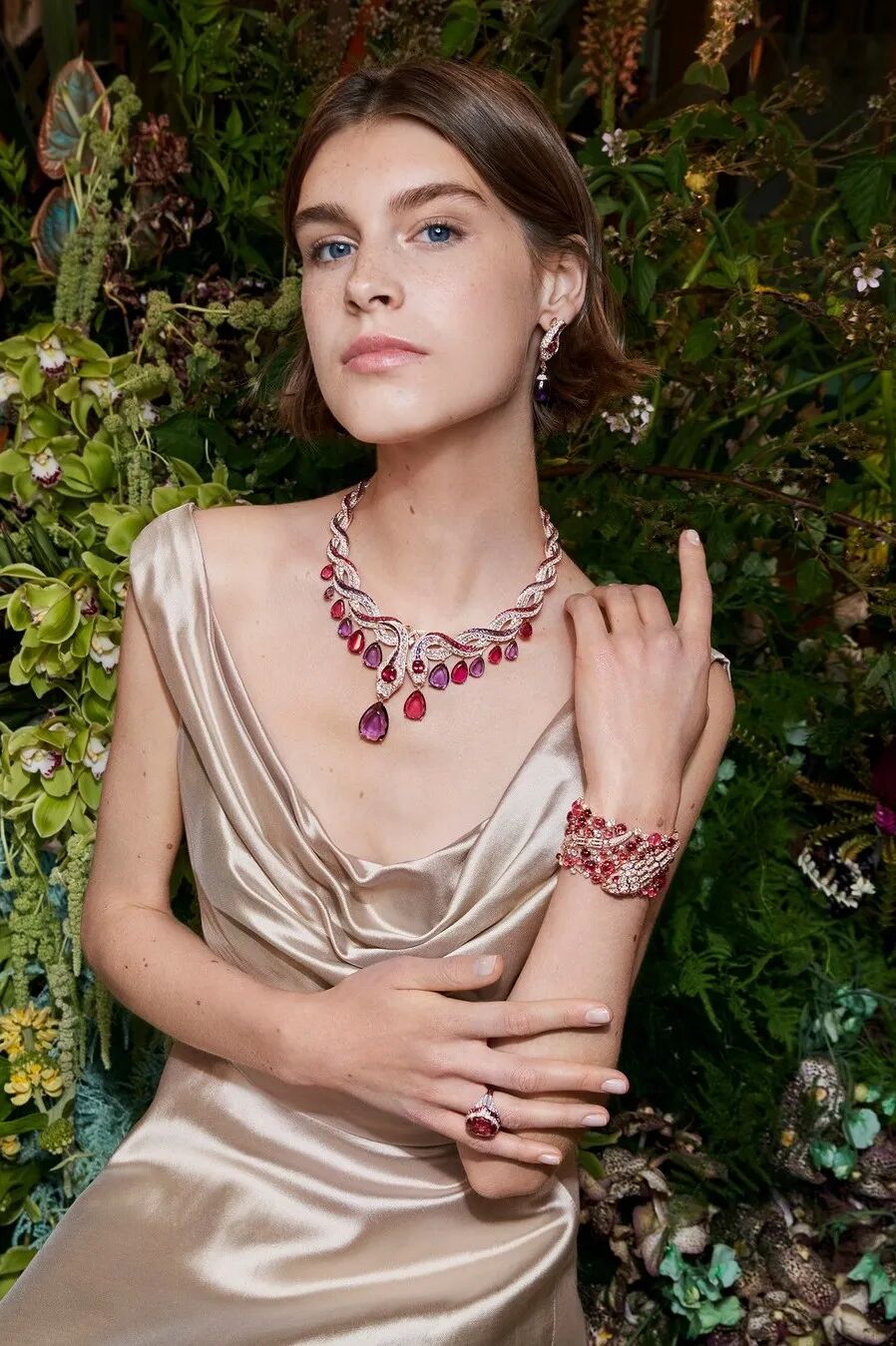 BVLGARI 的新年系列中,有洋红色的宝石项链。并且今年主推的高级珠宝系列中,也有不少洋红色珠宝,Anne Hathaway 带着拍过广告。