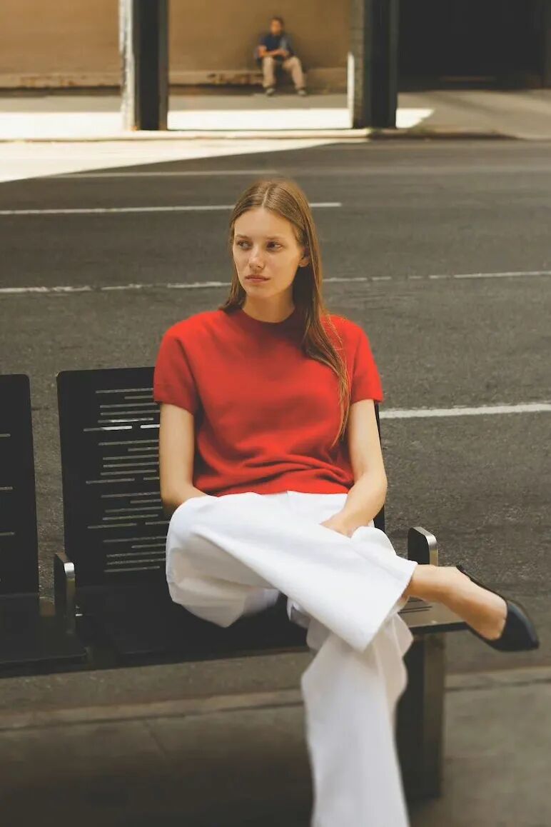 红色外套搭配白色针织衫和白色长裤,整身造型中有了一抹亮色,让人过目不忘。