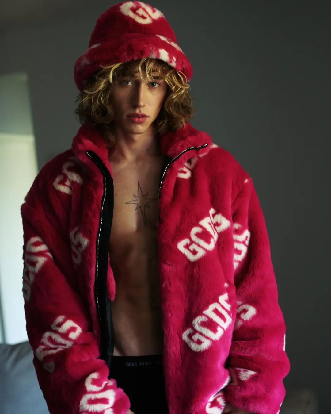 潮流系的 GCDS 今年也推出了洋红色单品,毛茸茸的夹克衫和渔夫帽,非常适合寒冷的冬天。
