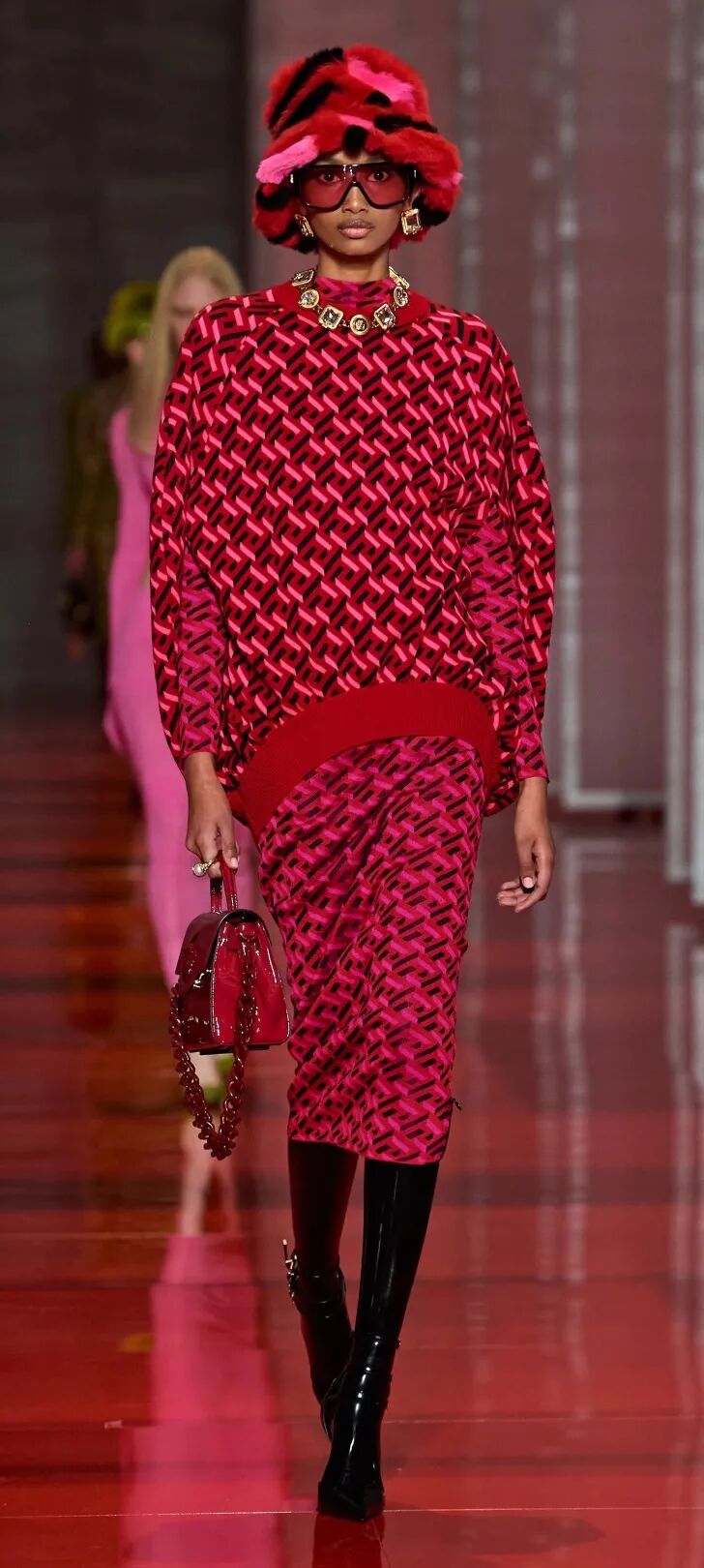 VERSACE 在 2022 秋冬系列中,就将洋红色作为了主要色系,推出了许多洋红色套装,外套、短裙、连衣裙,如果觉得大面积洋红太过明艳,也可以只穿一件,搭配黑色即可。