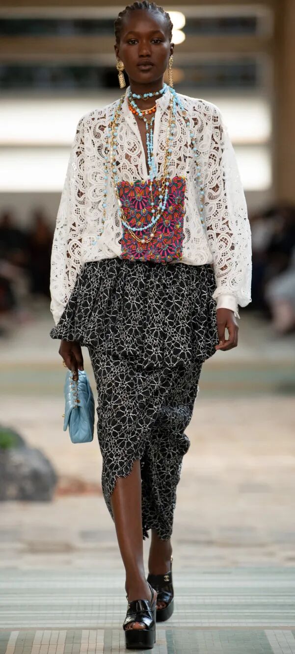 非洲的呼唤也贯穿于细节、配饰:珠宝和手袋上的狮子图案是对塞内加尔国徽和 CHANEL 经典标志的双重参考。项链中融入了贝壳元素。CHANEL 手袋经典的皮穿链被手工打造的木质链条替代。
