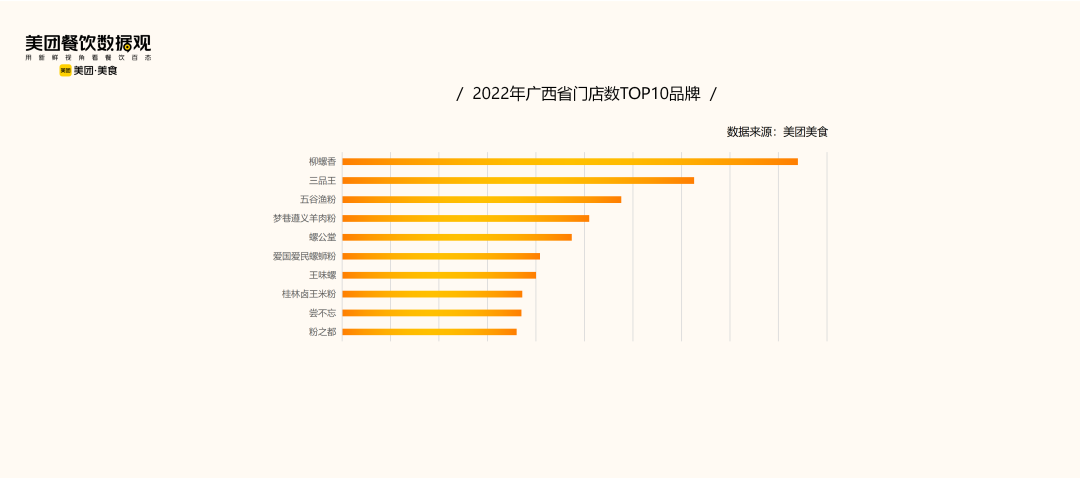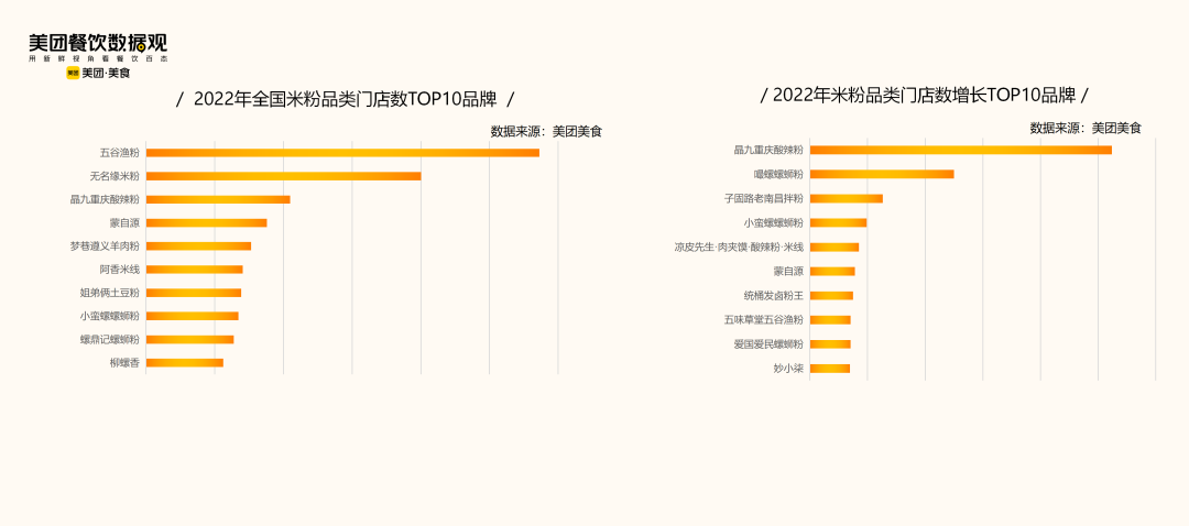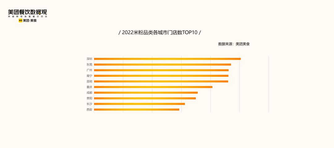 2022年米粉品类门店数TOP10城市分别为深圳、东莞、广州、南宁、昆明、重庆、成都、贵阳、长沙、北京;