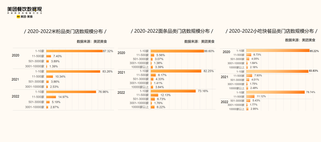 2020-2022年,江西省1-10家米粉品类门店规模逐年下降,达11个百分点,连锁化率提升显著;
