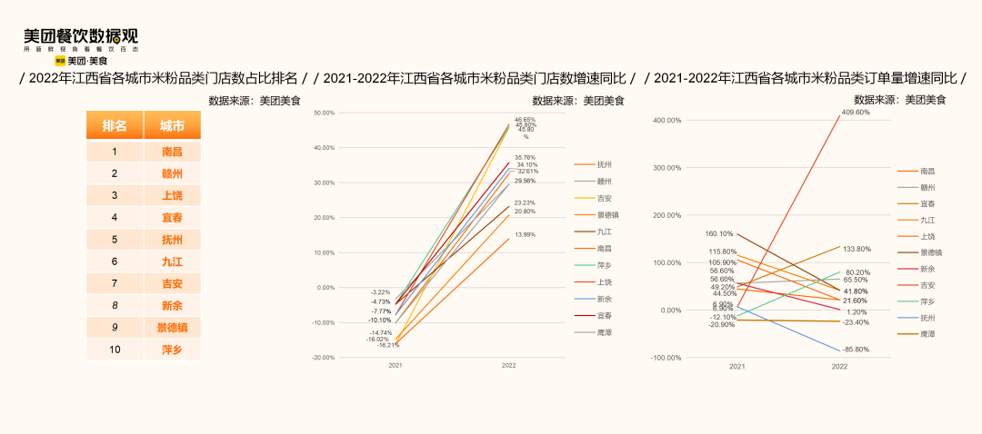 抚州、萍乡、吉安在江西省各城市米粉品类门店增速中占比靠前,其中抚州增速达到46.7%,订单量中吉安同比增速达到了410%。