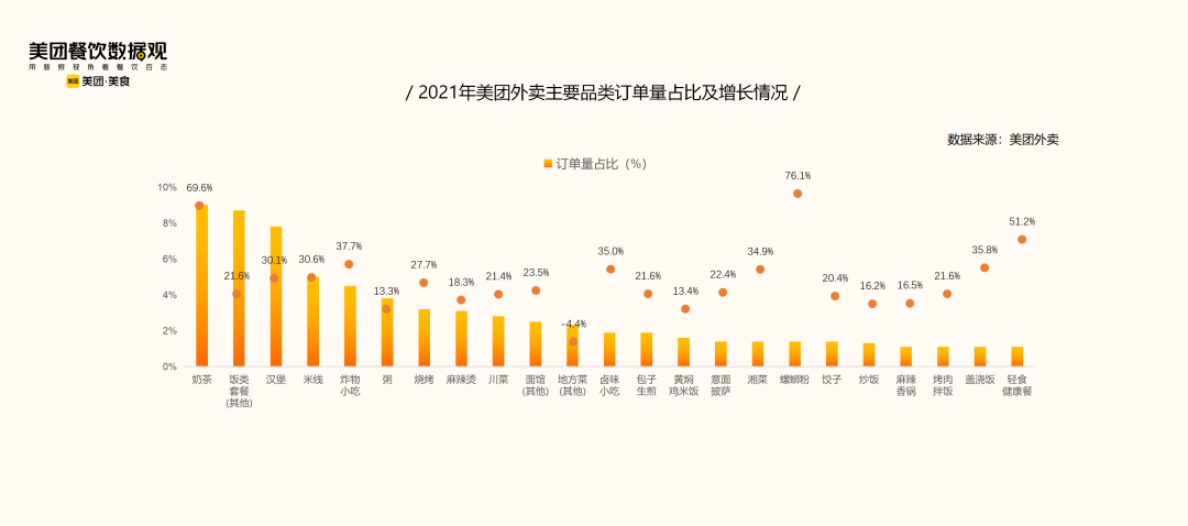 2021美团外卖主要品类中米粉品类订单量占比排名TOP4,增长30.6%;螺蛳粉订单量占比排名TOP17,增长76.1%,是主要品类中增速最高的。