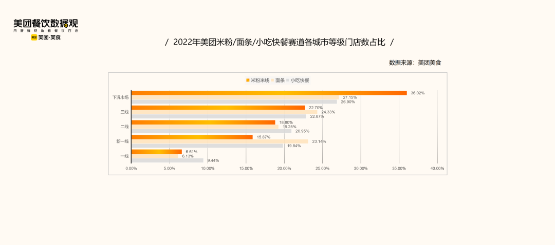 相比面条、小吃快餐赛道,米粉在下沉市场的门店数占比更高,和一二线市场明显拉开差距;
