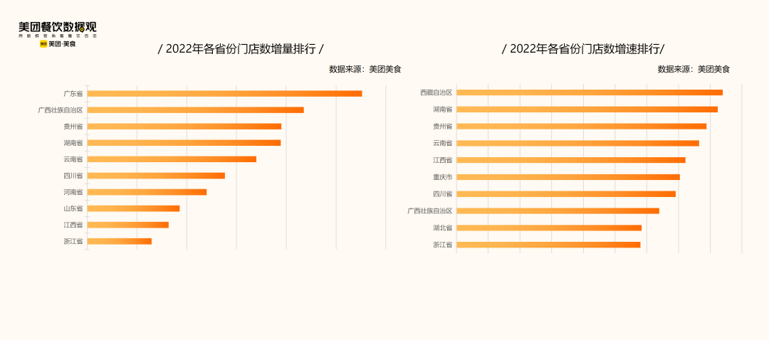 门店数增量排名靠前的省份仍集中于各米粉大省,湖南、贵州、云南等省份增速明显,大有后来者的架势;