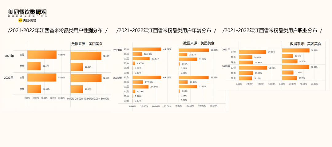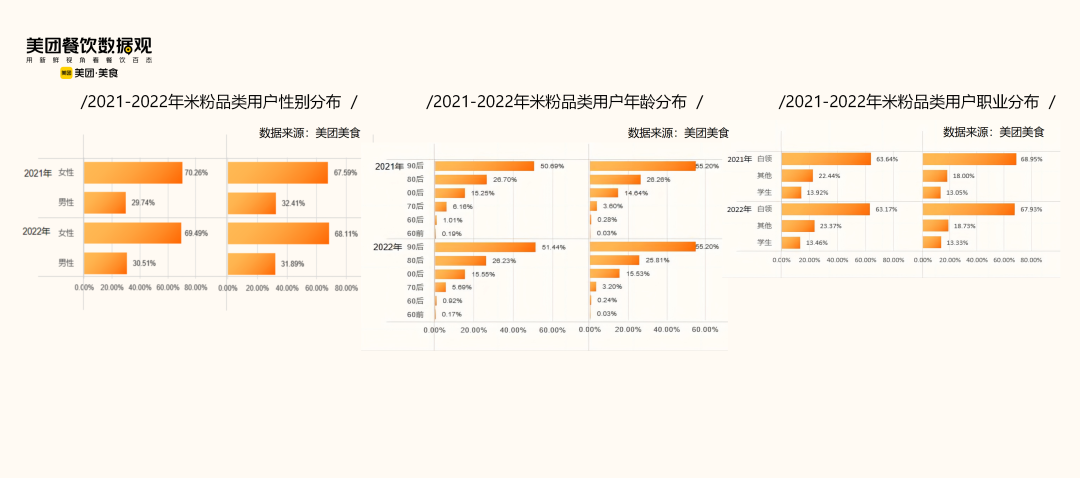 米粉品类的60、70后用户占比对比大盘用户数占比更显著;米粉品类白领群体低于大盘,而学生群体高于大盘。