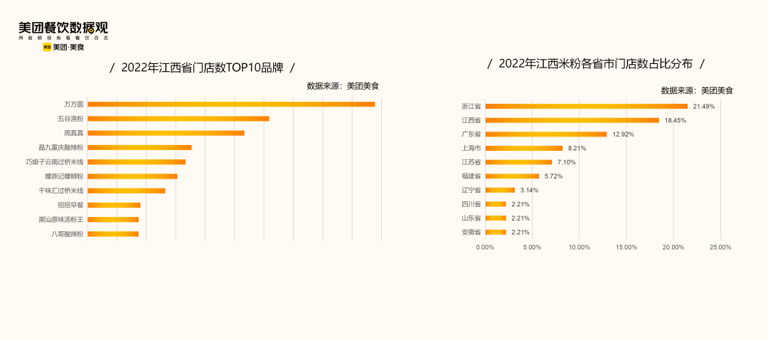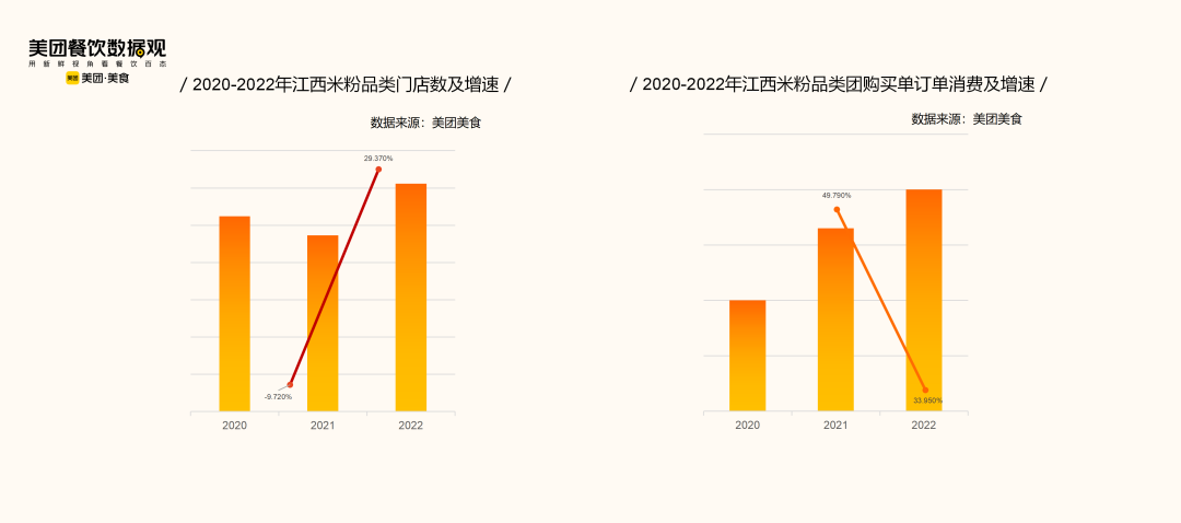 美团数据显示,2021年由于疫情放缓了门店发展,2022年江西市场重新恢复活力,门店增速达29.4%;2022年江西米粉品类订单消费增速减缓至,但整体订单消费仍保持增长态势。
