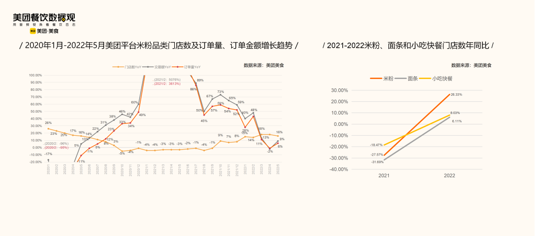截止2022年5月1日,美团平台上米粉品类餐饮门店总数达32.87万家;门店数扩张到今年已逐步恢复增长,上半年基本保持在15%以上的水平,同时订单金额回落;米粉赛道2022年门店数年同比达到26.33%,相比小吃快餐赛道和面条赛道,呈现出了完全不同的走高趋势。