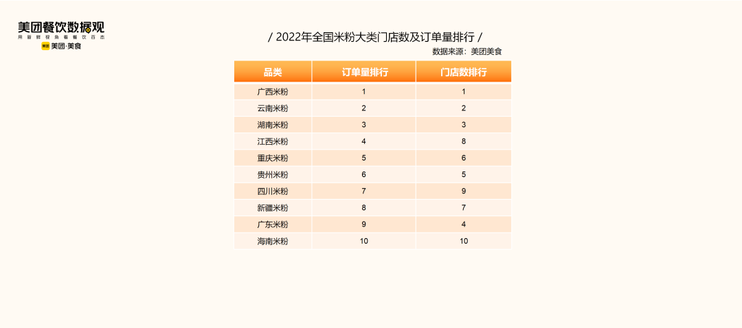 美团数据显示,2022年江西省米粉门店城市排行中,前三名分别为南昌、赣州、上饶;订单量排名前三为南昌、赣州、新余;