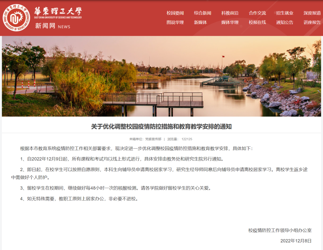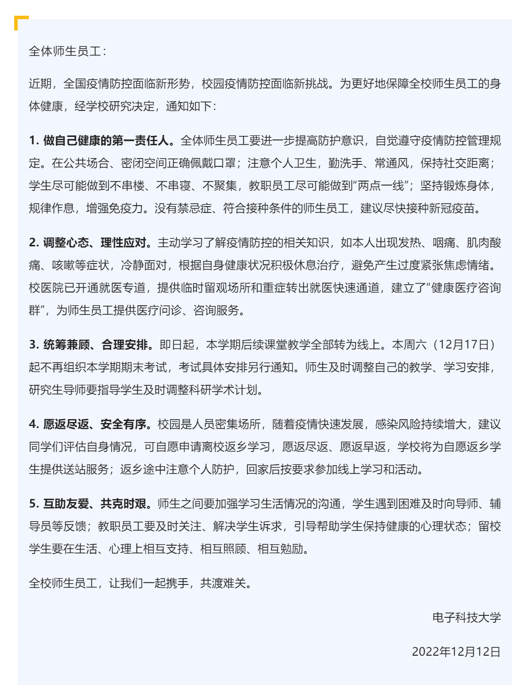 自2022年12月12日(周一)起,学校所有理论课程原则上按原定课表全部转为线上教学,需要线下开展的实践类教学活动安排到下学期进行。