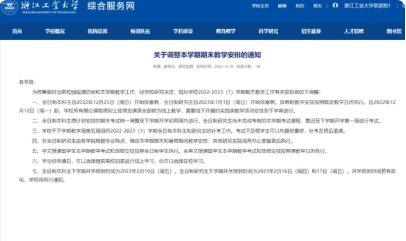 近日,浙江工业大学发布通知称:全日制本科生自2022年12月25日(周日)开始放寒假,全日制研究生自2023年1月1日(周日)开始放寒假。放假前教学安排按照既定教学日历执行。