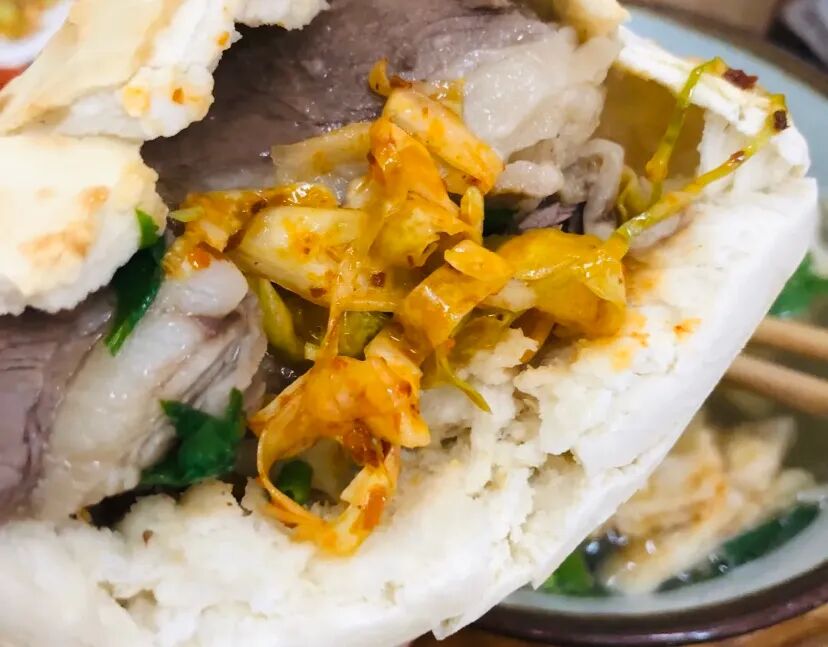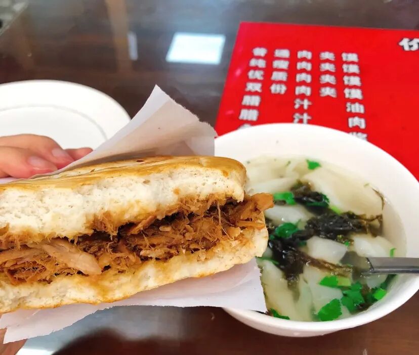 子午路现烤的白馍是正宗的「铁圈虎背菊花心」,外酥里软,恰到好处。肉煮得极酥软,就算不浇上腊汁也足够美味多汁。再告诉你一个好吃的秘诀:可以让老板多加点肉皮。![]()