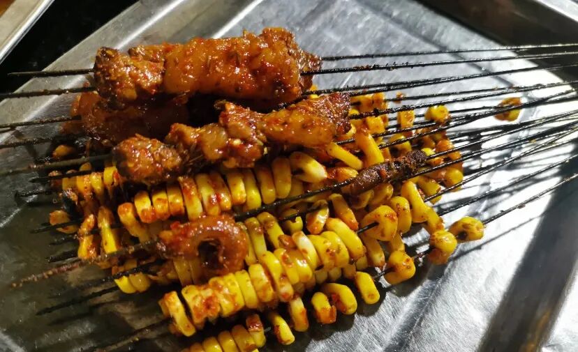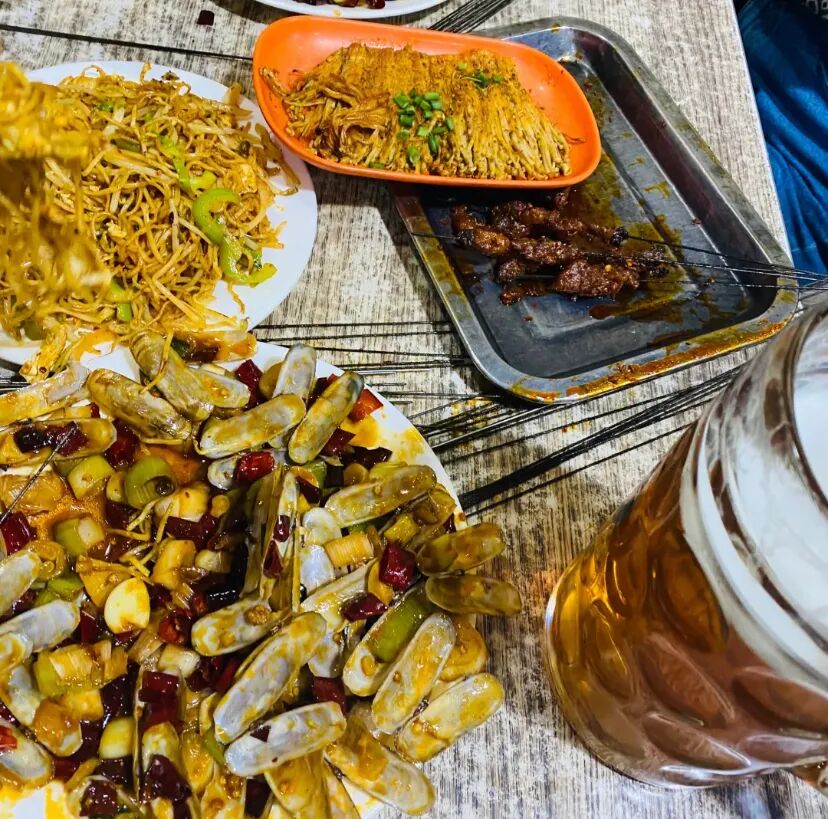 这家店生意好的时候11点还在排队,能开到凌晨5点的烧烤摊应该是有两把刷子的。前面说的两家烤肉店,那实打实全是烤肉,阿龙的选择就多了很多,各种烤蔬菜和炒海鲜都能吃上,还可以喝点酒嗨一下(清真店不能喝酒),江湖气满满。![]()