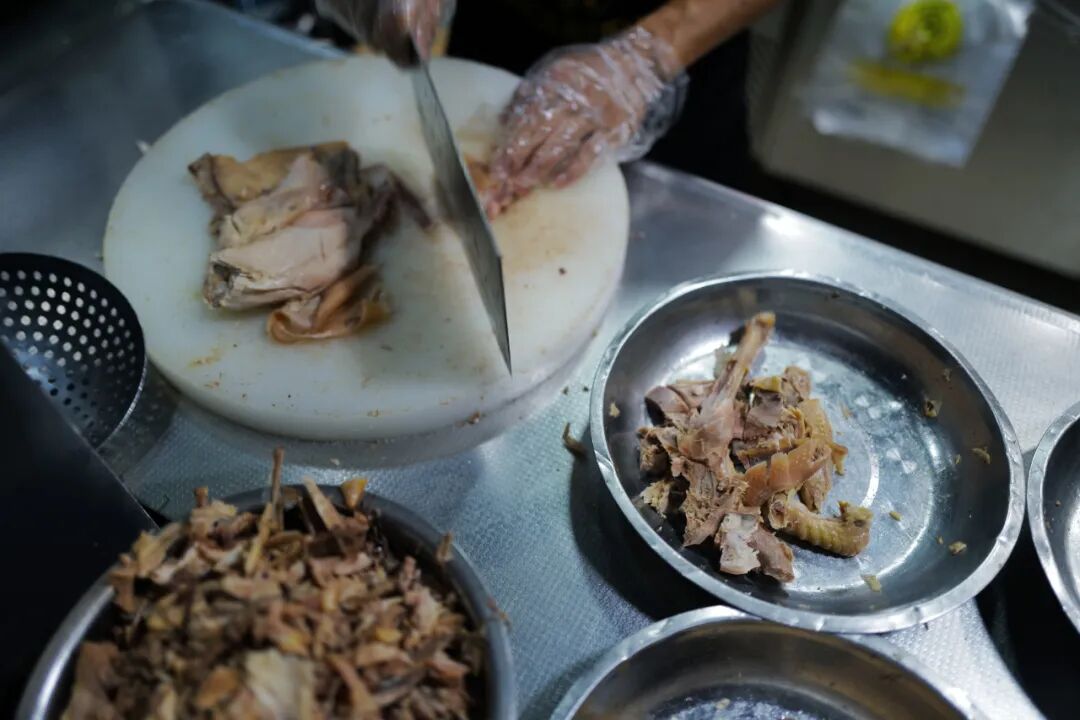 店里就只卖椒麻鸡一种菜,老板一个人勤勤恳恳地重复着拆鸡、切鸡、拌菜的动作。