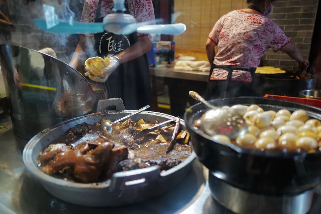 做的时候,要先在鸡肚子里塞入各种香料,然后放进白卤汤汁里焖煮。鸡肉吃起来咸香紧致,特别是鸡皮爽滑又剔透,这是老板多年积累的手上功夫。