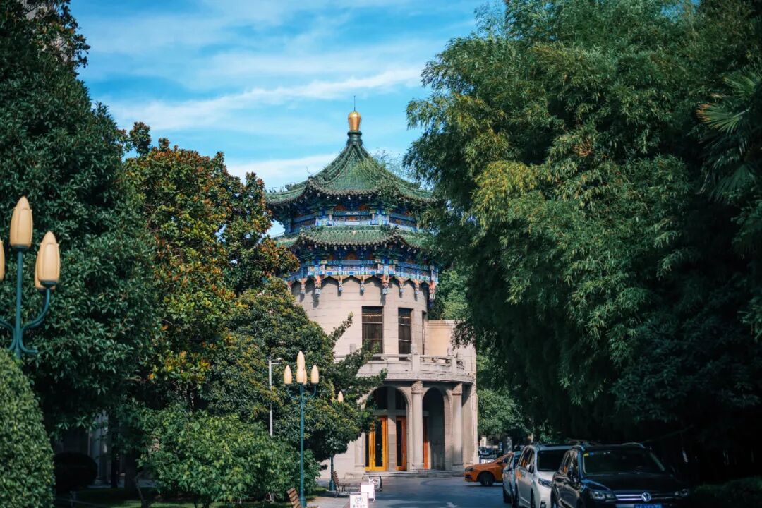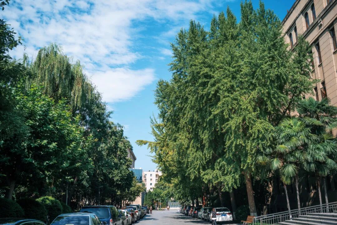 而中式风,则体现在整个大院之中。琉璃瓦片的八角亭、白玉兰的路灯、还有院子里大片的银杏......