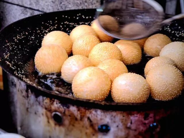 刚从锅里捞出来的欢喜坨,外形似球,外酥内软,圆圆的一只很是可爱。轻轻用筷子一夹,立马就泄气了,跟纸老虎一样。(其实和江南的麻球差不多)