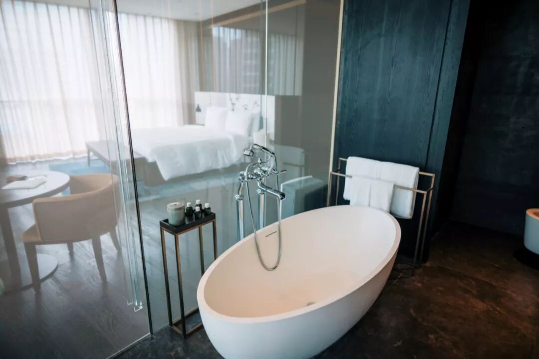 浴室则是黑色系,和房间由全透明玻璃隔开。这样的酒店,双洗手台一直是标配。