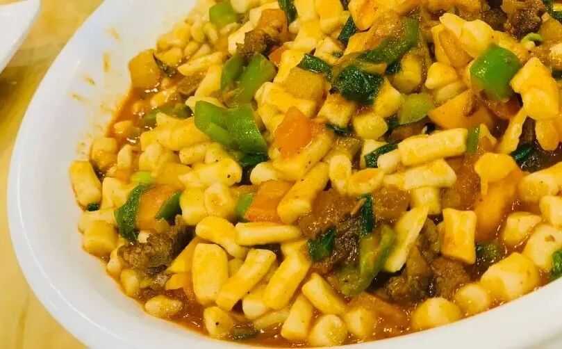 店里的丁丁揪面也很有名,揪面比面片更厚一些,更有韧劲。和羊肉、紫皮蒜、番茄一块炒,汤汁浓郁。唯一的缺点就是量太足了,两个人可能都吃不完。
