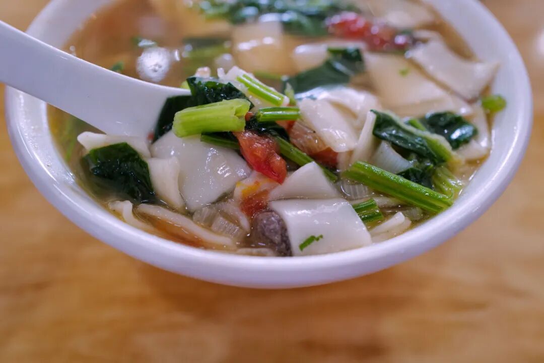 它用的是面片,加了牛肉丸、番茄、青菜作配料,吃之前加点醋和辣,味道更好。