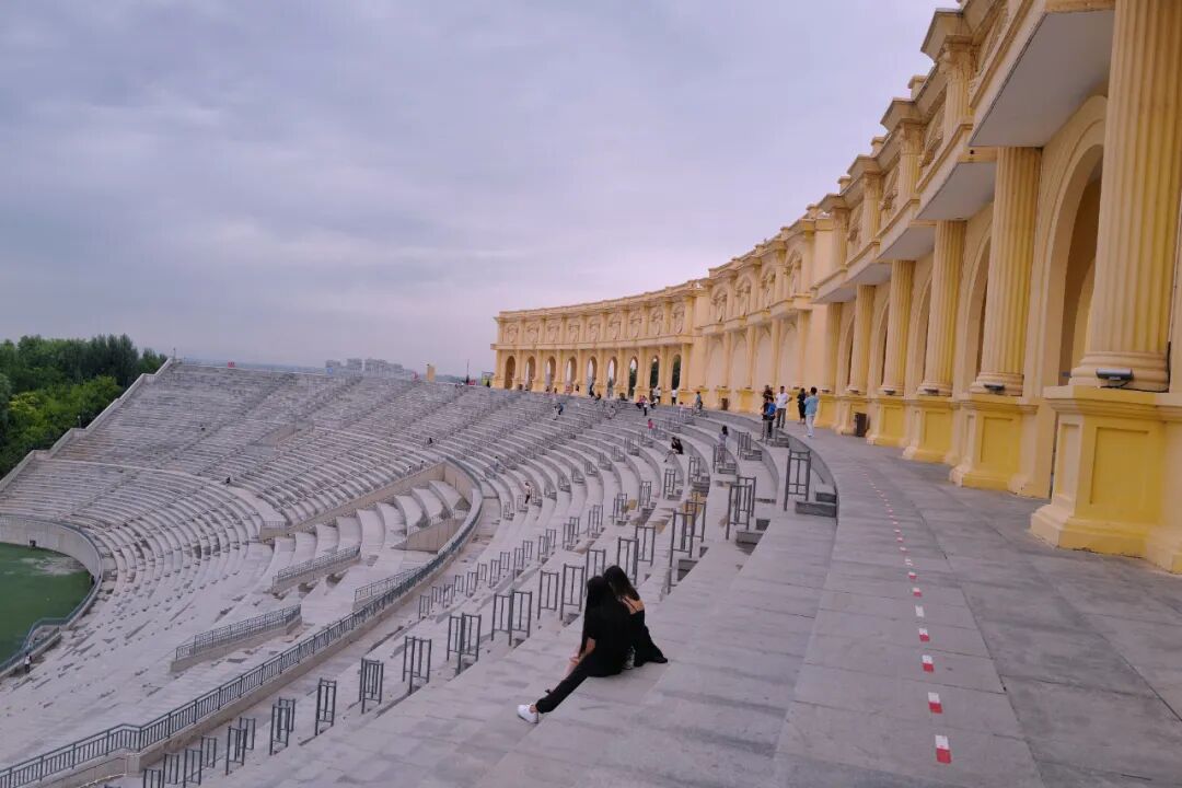 览山公园其实是个堆出来的小山坡,爬上楼梯之后,你就能看到一个巨大的、仿古罗马斗兽场的建筑。