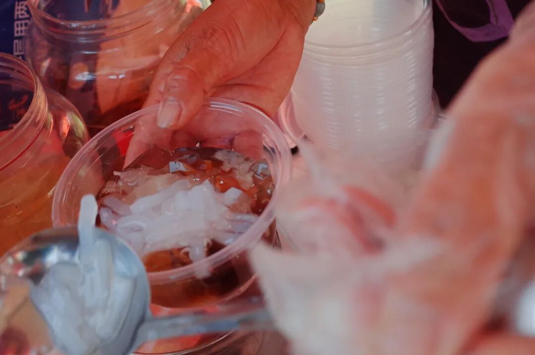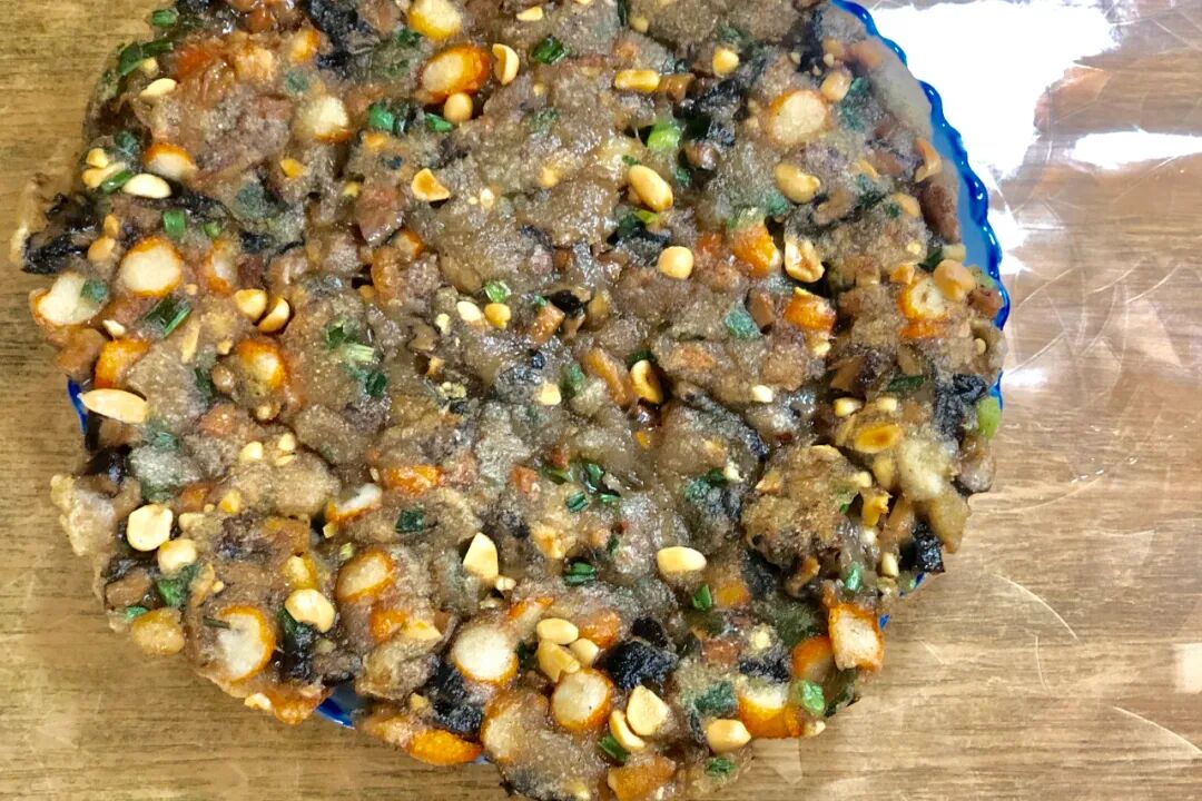 在平潭的饭店里随便点一份海蛎煎都是超大一盘,十分实在。海蛎煎的外皮香脆酥、并没有油煎后的油腻感,内里鲜美多汁,充满海蛎的浓郁海味。四果汤是福建闽南一带非常出名的特色小吃。有各种各样的时令水果、红豆、石花膏……甚至还有QQ糖任你选,再加上冰糖水和碎冰就是一碗四果汤了。当我们正午时拖着脚步从猴研岛走出,来上这样一碗后,让人直接就原地满血复活了。在我眼中,冰饭算是四果汤的姐妹版,做法类同,里面繁多的东西也差不多,只是多了几团糯米饭。想尝鲜的话,倒是可以两样都试试。在平潭还有几个名字很吉利的本地特色菜,出门穿衣都要看五行的我,自然也好奇地都吃了下。天长地久其实被当地人又称为油羹,外形跟油炸饺子差不多,是平潭人家有喜事时必不可少的一道菜。刚炸出的天长地久,外皮又糯又香,内里的糖经过高温后化成糖浆,裹着花生和些许的葱,甜中有咸,有点像五仁味,但绝对不会过于甜腻,我一口气连着吃了四五个都不在话下。时来运转又叫咸米时,有些类似于江浙这边的青团。但它的皮是用地瓜和木薯粉做的,一个咸米时好坏的关键也就在这外皮,皮薄而细腻,Q 弹柔软,这才说明你真的会做咸米时。咬开后就是满满当当的馅料,紫菜、鲜虾、猪肉、胡萝卜丝、干萝卜丝、洋葱等等,味道鲜甜。即使刚吃完一大个,也很难拒绝再来一个。一团和气的别名其实是八珍炒糕,这也是比较常见的叫法。和跟“天长地久”“时来运转”一样,八珍炒糕里缺少不了一个重要原料,那就是地瓜粉。咸肉丁、蟹肉、花生、鱼丁、虾仁等等佐料和地瓜粉融在一起,呈透亮的饼状。软糯的地瓜粉糊包裹着各种配料,夹起一筷入肚,口感丰富到仿佛在吃海鲜版豪华切糕。除了上面这些来平潭必吃的小吃美食外,再给大家推荐两家店。这家店是打车时司机强烈安利我们的,说是本地人都去那吃。到了后发现这是家酒楼,别人都是一大家子过去吃,我们就两个人跑去了。但老板娘很随和,看我们人少就把菜尽量都做成小份(但小份也非常实诚,巨大一盘
