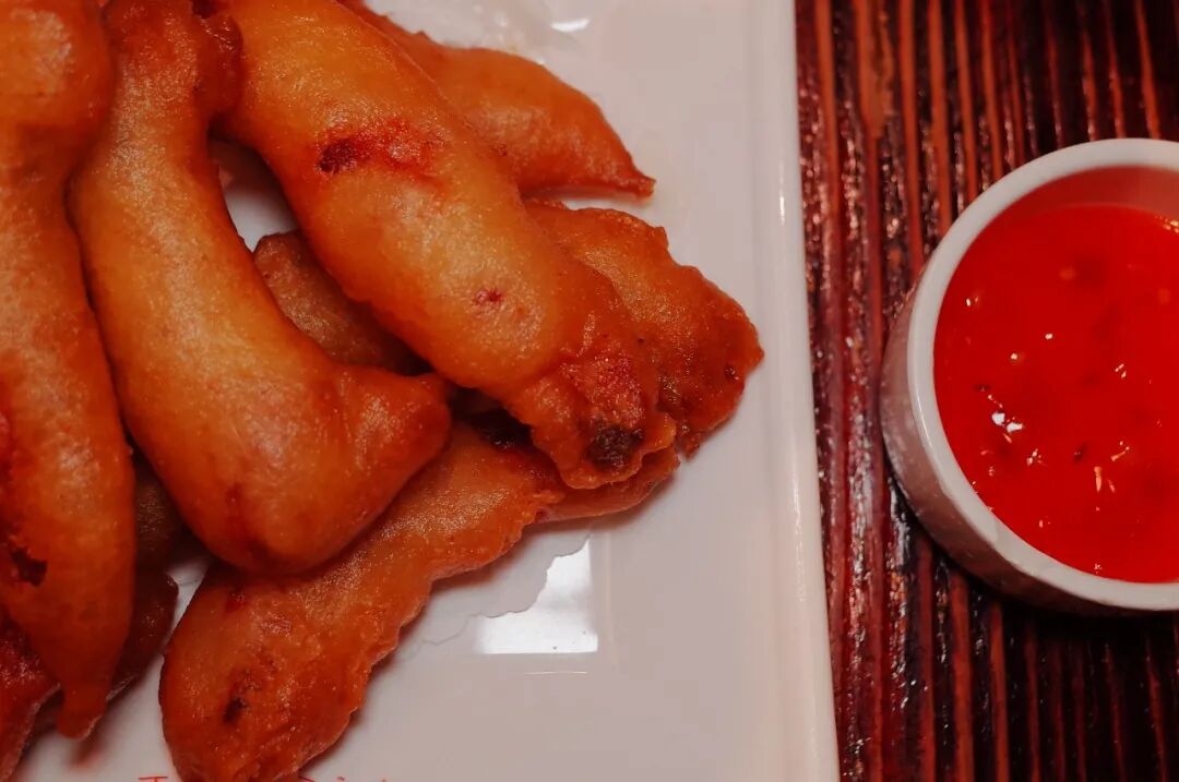 而鱼饺的鱼是指饺子皮是用鱼肉和面粉按照一定的比例做成的面皮,因此鱼饺皮和平常饺子不同的是,它是透亮有韧性的,带着鲜甜的鱼味,再配上蘸料,一口一个~对于炸物一向热情很高的我,倒是第一次吃炸鳗鱼。平潭的炸鳗鱼其实内陷里的鳗鱼是经过老酒、红糟等调料腌制过的鳗鱼,因此咬一口后,口腔里就糟香四溢,毫无腥味。而外层金黄的面衣,也炸的恰到好处,鲜嫩香酥。再蘸上甜辣酱,咸中带酸甜,一下子吃了三四个的我,实在很想把这道炸鳗鱼推广到全国炸物菜单里。平潭海蛎量多质量好,虽然个头小,味道却很浓厚。海蛎煎就是以满满的海蛎作为主角。![]()