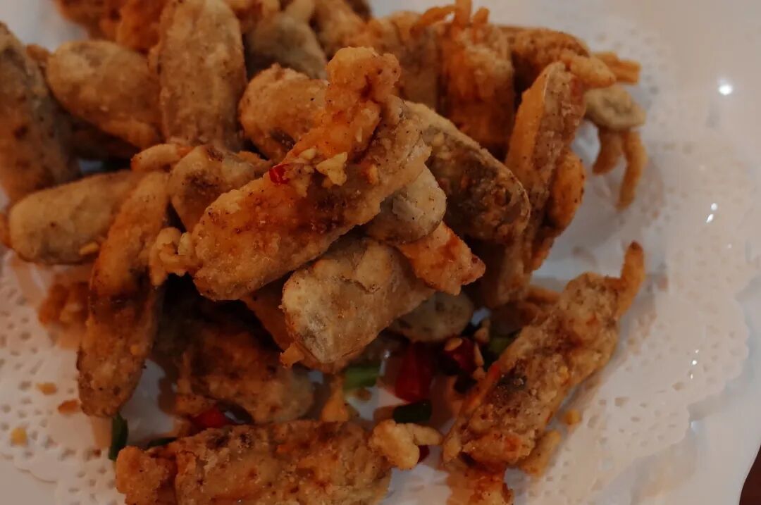 冬粉其实和平时吃的粉丝差不多,但当这口感弹滑的冬粉吸饱了海鲜的高汤,它就升华了。再加上鲜虾、乌贼、海蛎等等小海鲜的助攻,使得这道菜鲜上加鲜。椒盐蛏子第一次见到这种做法的蛏子。剥了一半的壳,裹上面粉再丢进油锅里炸了下,最后撒上椒盐调味。简单来说的话,可以理解成是蛏子天妇罗。![]()