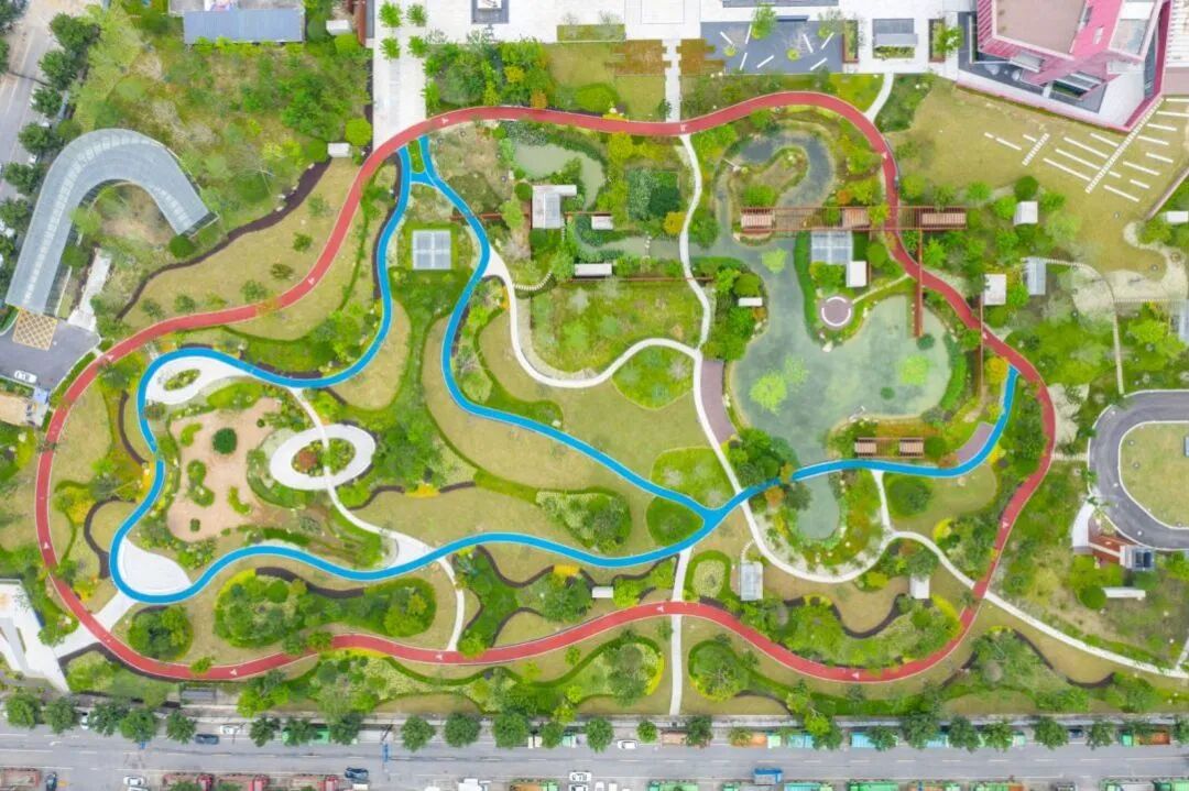 该园为净水厂上盖公园,以“水·人·情”为设计理念,通过土地复合利用,开辟中央水景、植物认知园等水文化展示、科普教育空间,供儿童玩耍、学习,寓教于乐,让儿童融入大自然。同时植入健身跑道、休闲廊架、休憩坐凳等设施,为居民提供健身、休闲场地,并设立树木认养机制,强化市民生态保护意识。公园集多种功能于一体,满足居民日常休闲活动需求。