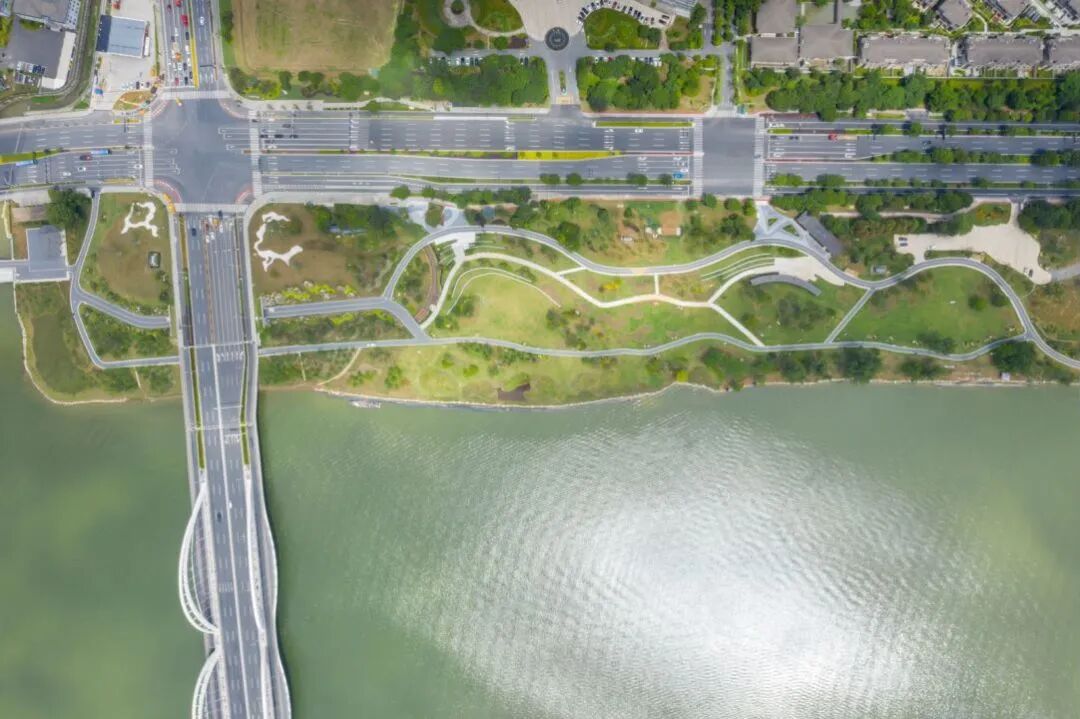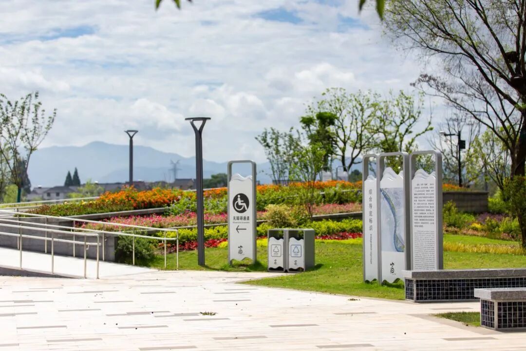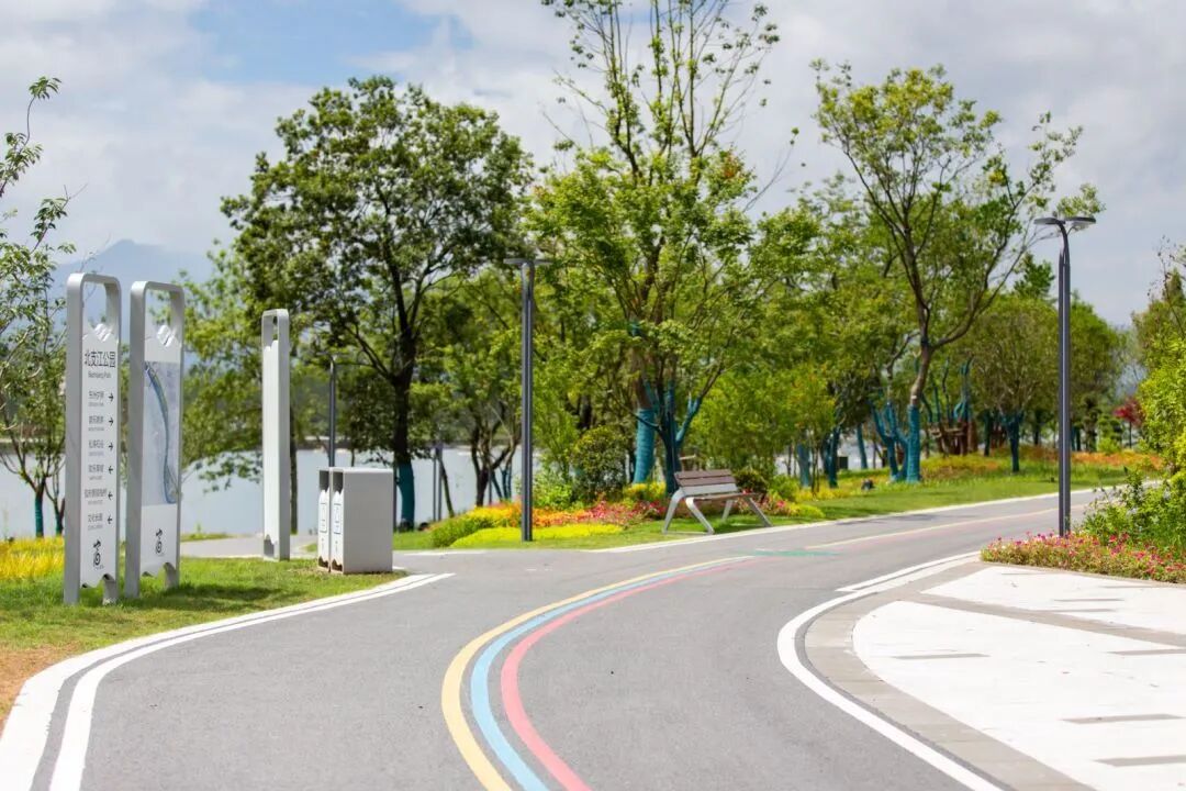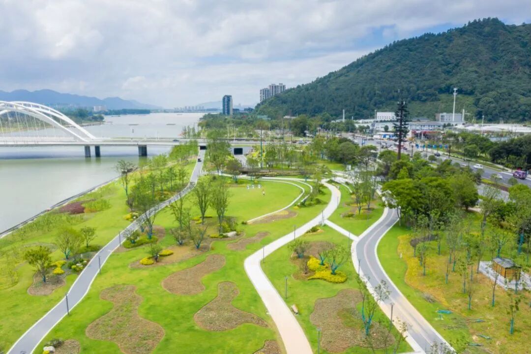 公园与富春江岸南侧亚运场馆遥相呼应,重点打造线性沿岸观赛长廊,局部设置挑空平台,打造亚运会水上观赛点,也可作为沿江风光观景点。园内设置健身步道、条石坐凳、休憩廊架、亲水平台等,可满足人群健身休憩需求。