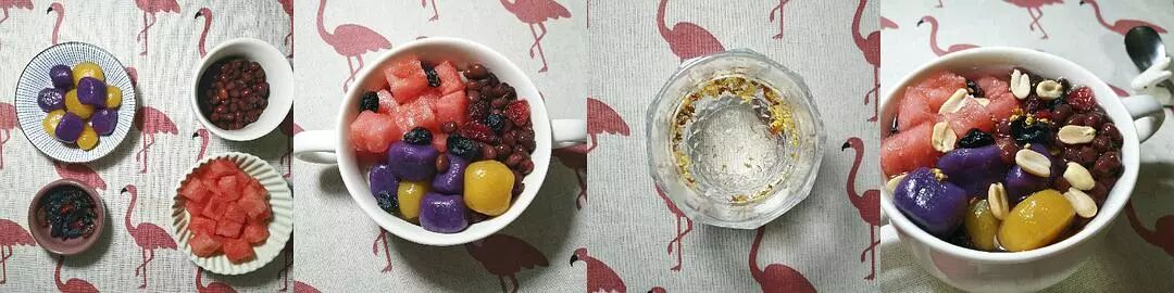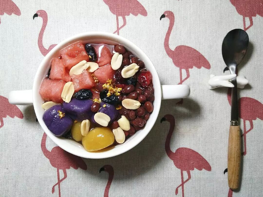糯米、红豆、芋圆、西瓜、果干、桂花干、花生碎