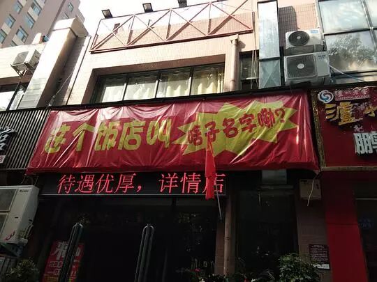 昨天在街上刚看到一个,一个残破的推车路边摊,卖夹饼、馄饨、茶叶蛋,大红招牌上写了个**食府……好大的口气😂