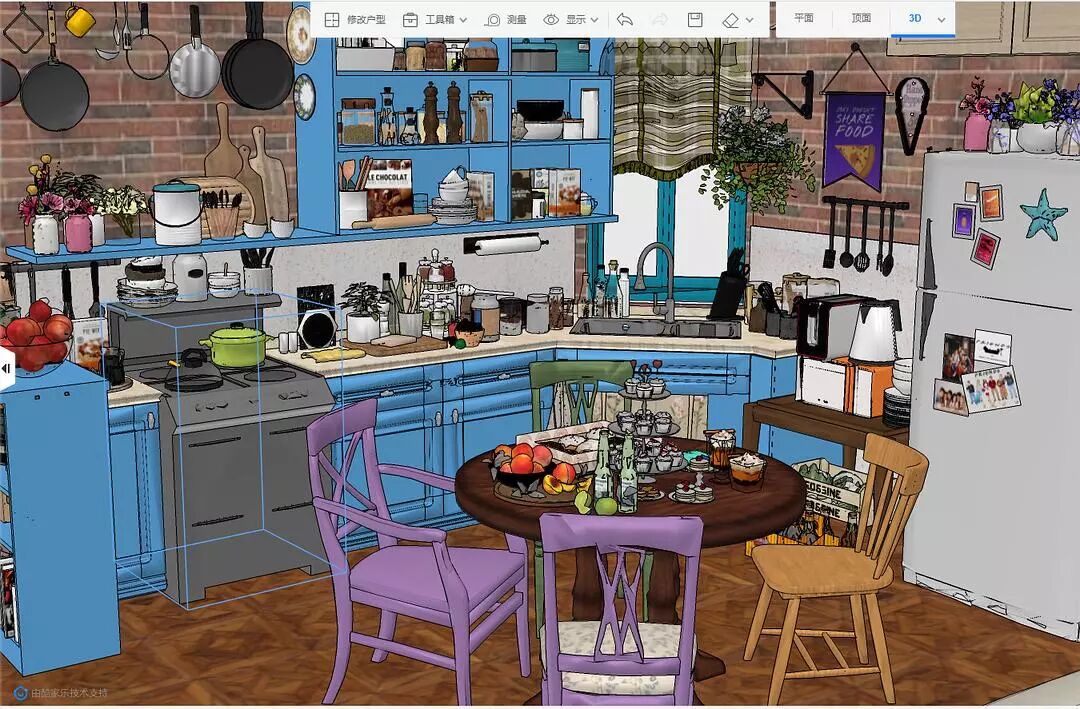 莫妮卡擅长美食烹饪,所以厨房是重点,也是出镜率非常高的场景,橱柜是用了设计工具自带的全屋定制功能做的,还比较方便,主要是那些小东西,楼主放到手断。