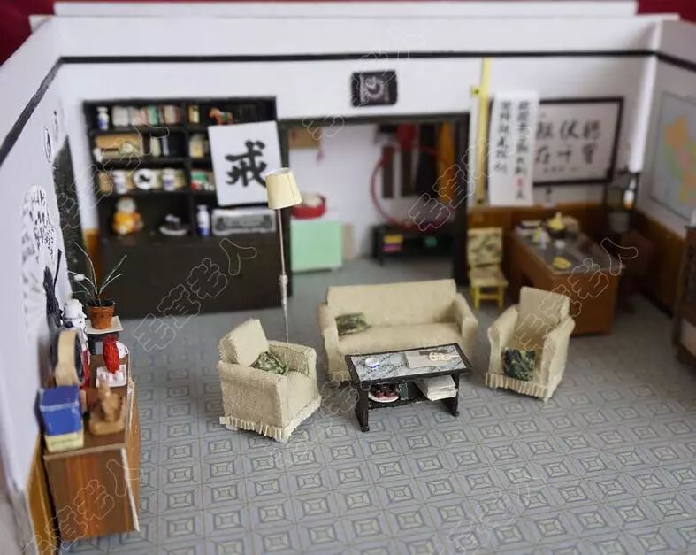 模型以前40集的摆设为基准,比例为1:40,材料以食品包装纸盒为主,辅以硬纸板和极个别的其他材料。
