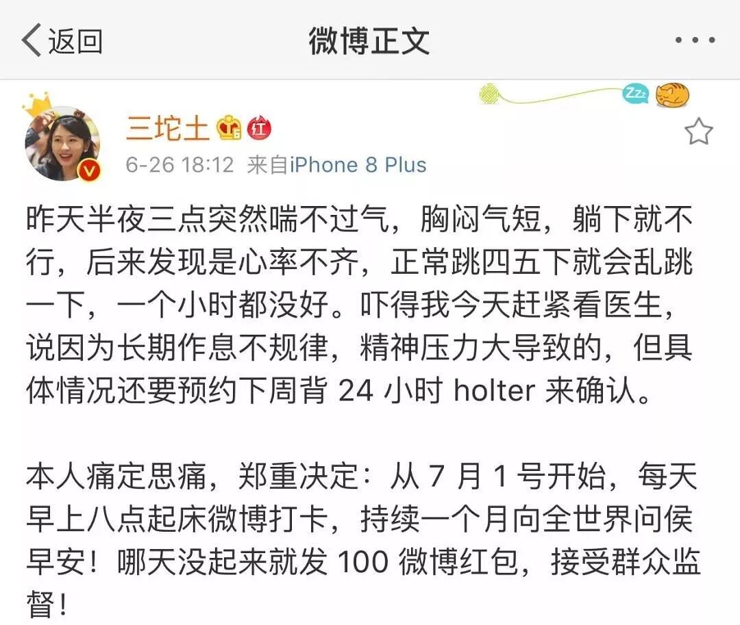 突然要改掉陈旧积习,谈何容易呢?所以我决定来点狠的,在微博打卡,接受网友监督,并设立了一个惩罚机制:只要八点之前没发微博打卡,就要给大家发 100 块红包。