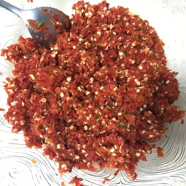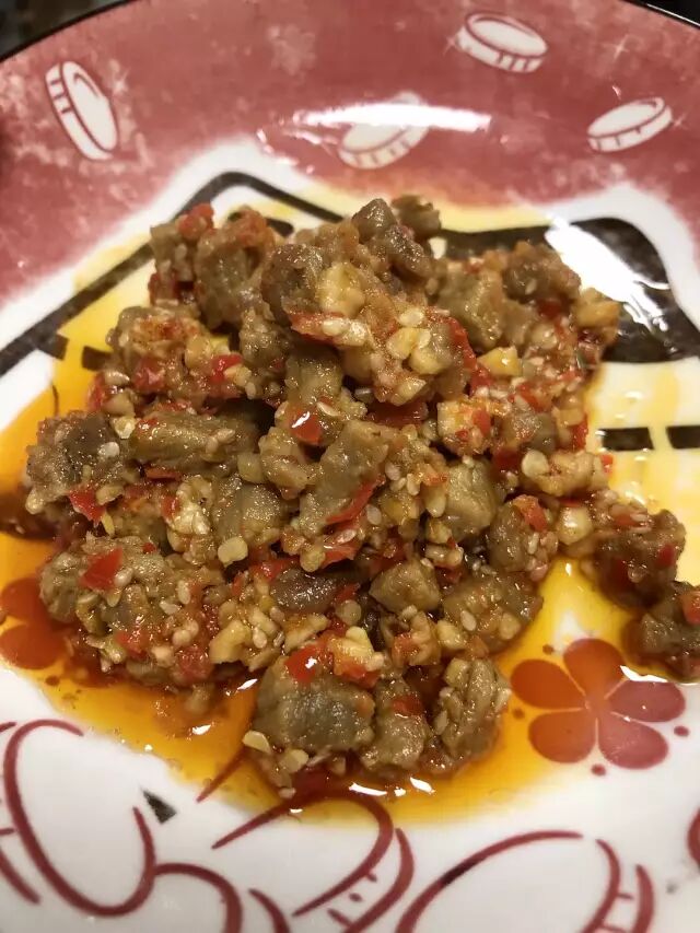 周末晚上朋友来做客(带着一箱海鲜让我给做熟一起吃),走的时候送了瓶(400ml)当晚刚出锅的牛肉辣酱,过了两天电话☎告诉我说已经吃完了(电话中传来勺子🥄掏玻璃瓶底的当当声和吞咽咀嚼吧唧嘴声)……