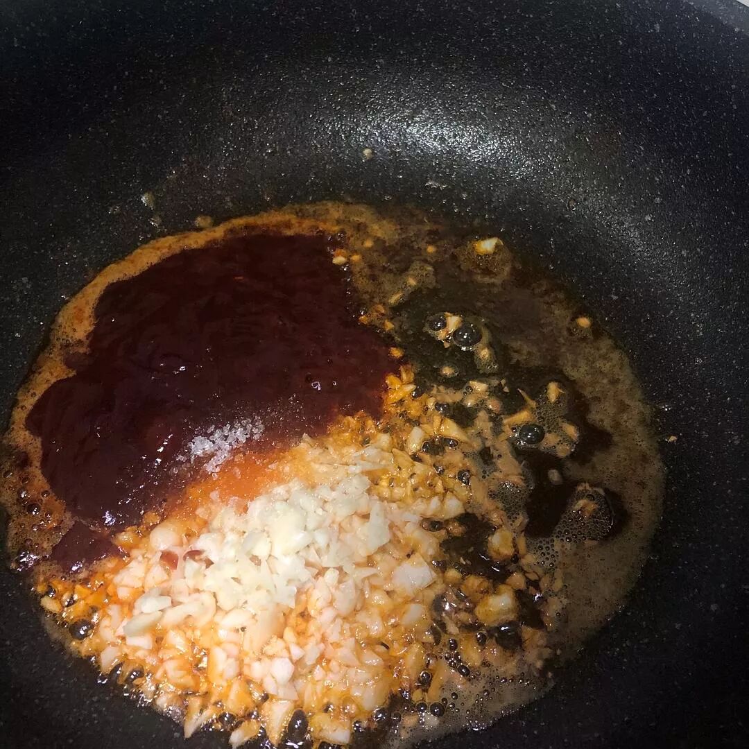 5、在锅里放入大量蒜蓉爆香,倒一堆番茄酱和一点白糖,把酱炒香