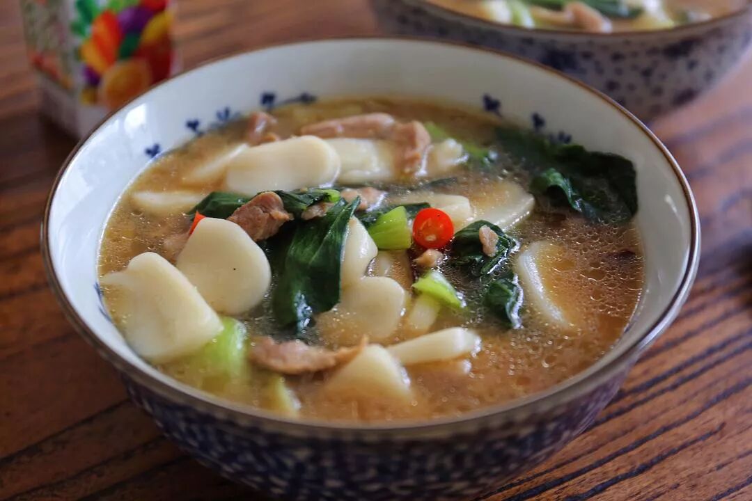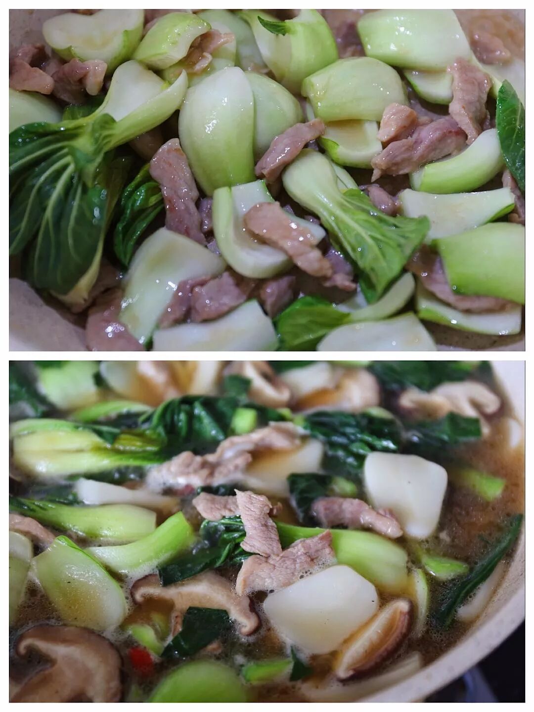 做法:年糕用水浸泡,猪里脊用a腌制一会儿。热油炒到金黄,下青菜梆加一点点盐和糖一起炒,炒软一些了加水、菜叶、香菇、小米椒,煮开后下年糕,加酱油调味,煮大约3-4分钟,出锅前加一点白胡椒。