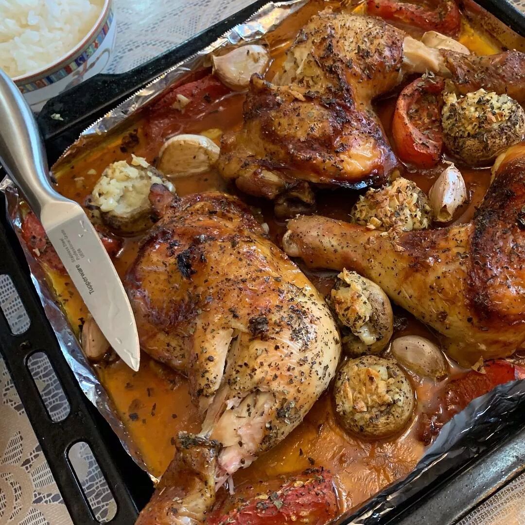 土豆切片,番茄切片铺在烤盘底部,放鸡腿,大蒜不剥皮(剥皮就烂了),还可以加蘑菇。再撒一层盐和罗勒碎,不怕胖可以把黄油切小块块丢进去。