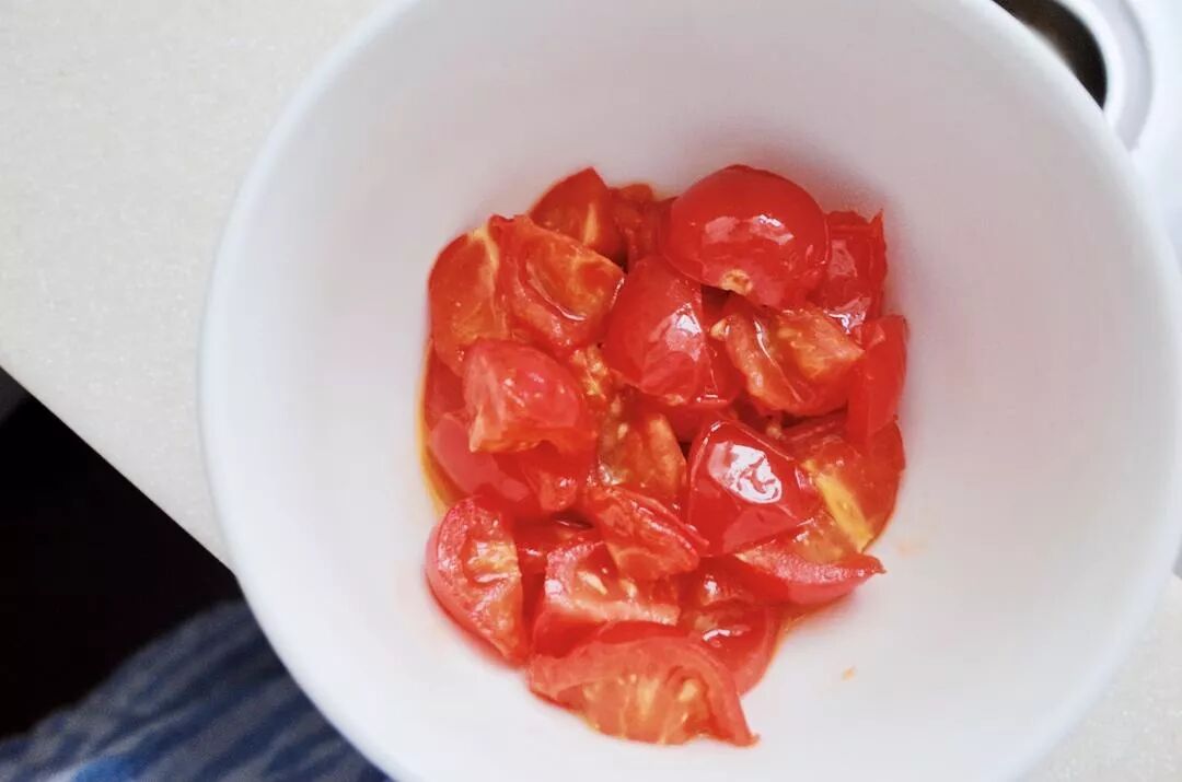 把西红柿换成小番茄,是因为我觉得小番茄更香甜味道浓。稍微炒软后的汁水会更香~面条过凉水后再加点芝麻油拌匀,面条会更爽滑易拌开。