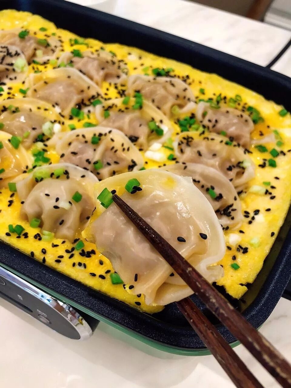 2.锅里擦一点油,饺子不用解冻直接放里面,然后小火煎到微微发黄。