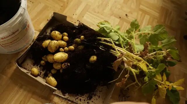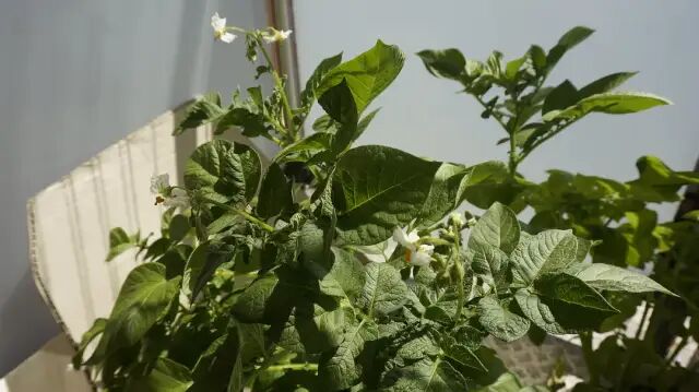 我两盆土豆,一盆拿到室内晒不到太阳的地方一周,就黄了