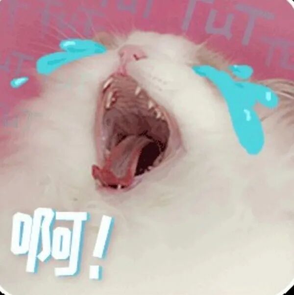 粉色背景。猫是糊的。一个白色的小奶猫特别可爱。头朝着右边,嘴张很大,配字是“啊啊啊啊啊”之类的。
