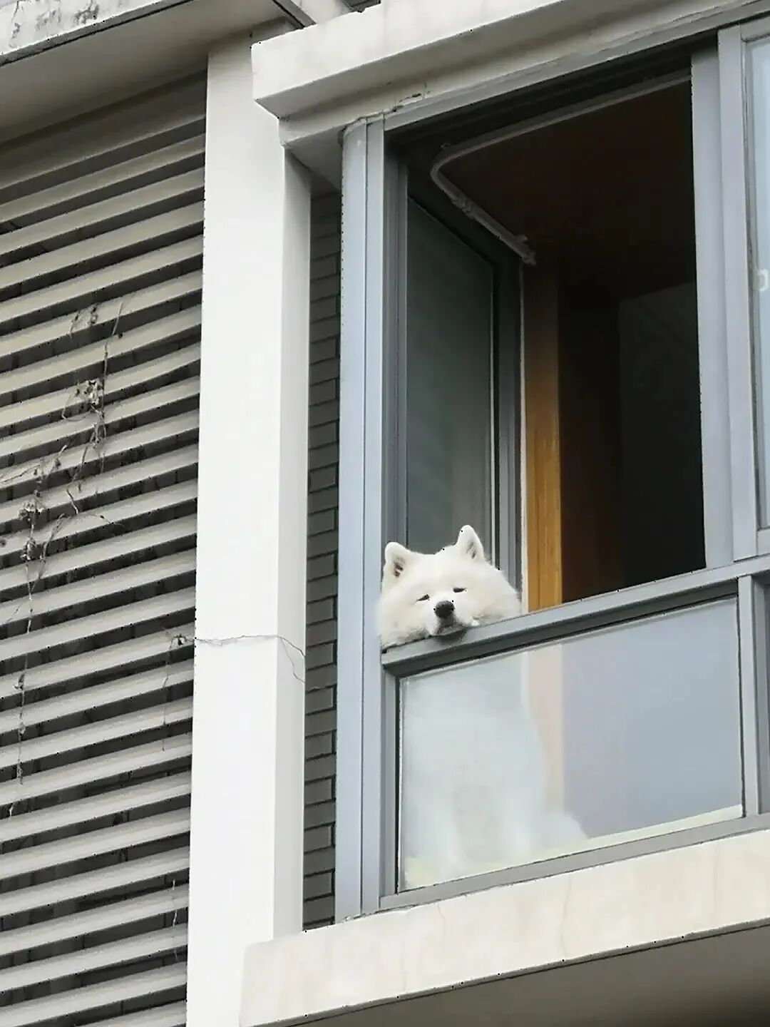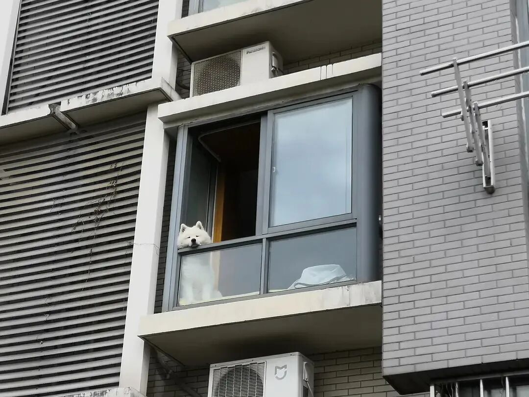 昨天去取快递,回来的路上骑车,突然发现教师公寓的窗户上有个萨摩耶探出脑袋,好可爱啊呜呜呜,它看起来表情好愁啊,把下巴抵在边边上啊啊啊,我们在下面挥手打招呼它也无动于衷,听室友说上次它也是在那里,但是那家主人好久没开窗户了。