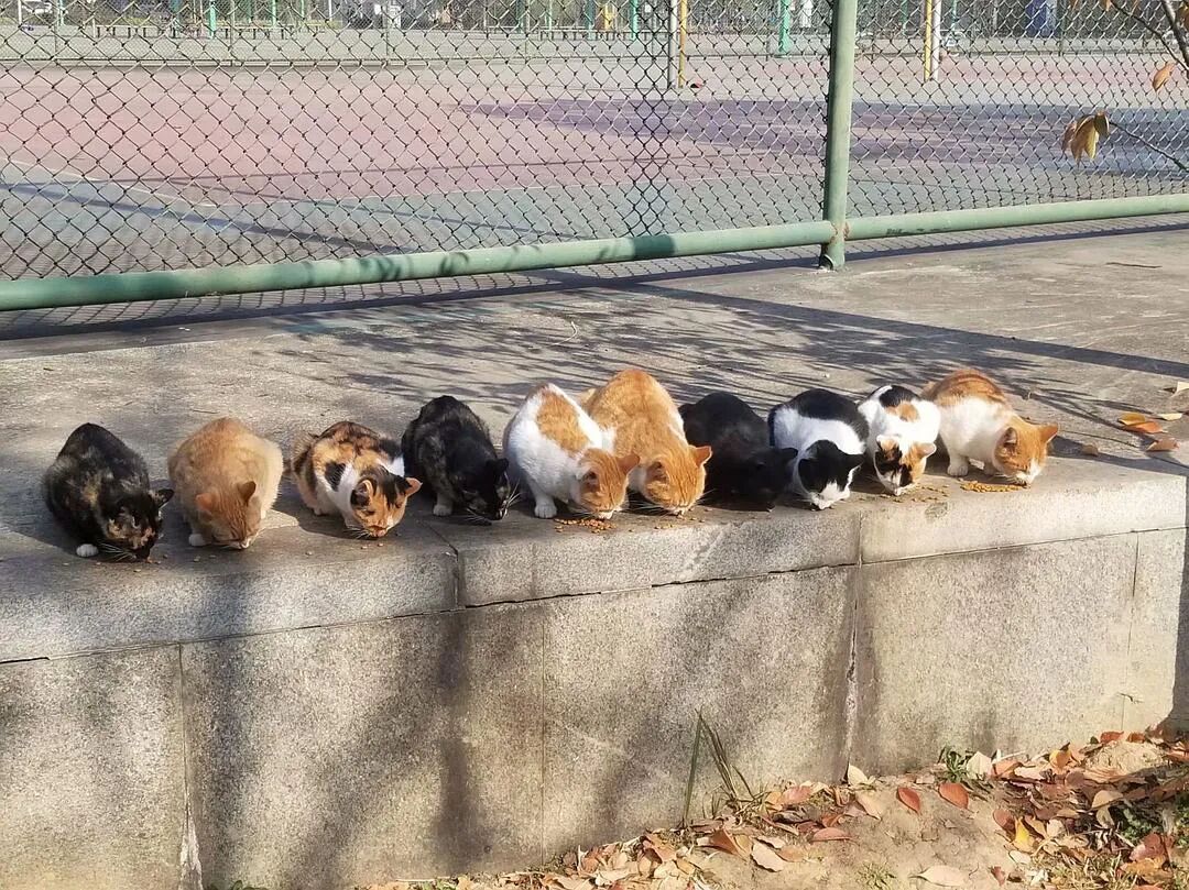 篮球场旁边排成一排乖乖吃粮的小猫咪 好可爱!!!!!! 排排坐吃果果 来自豆瓣小组“可爱事物分享”