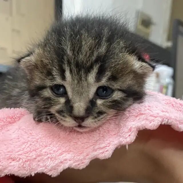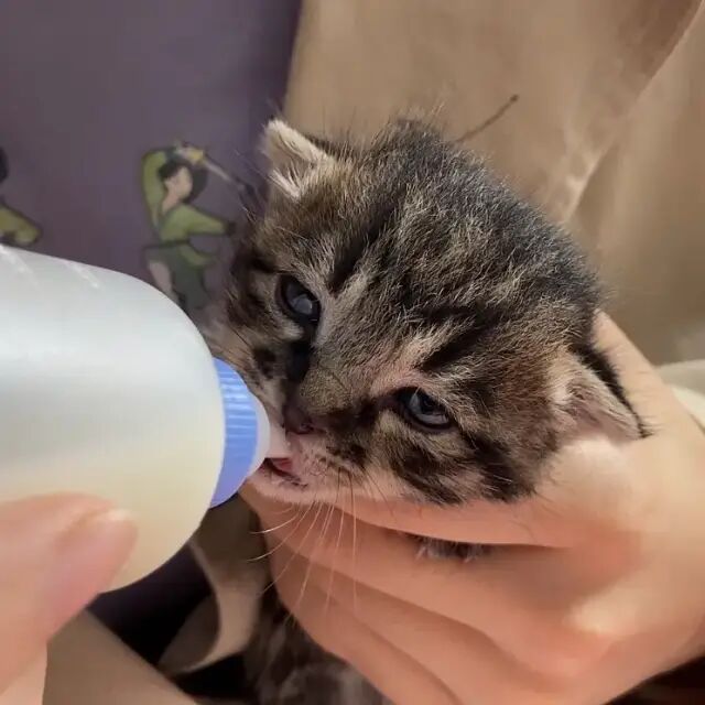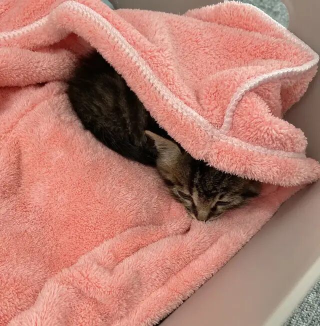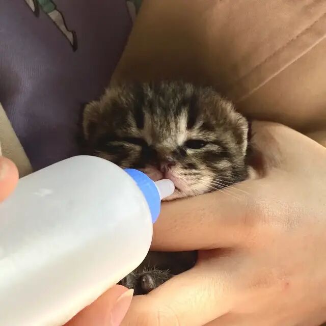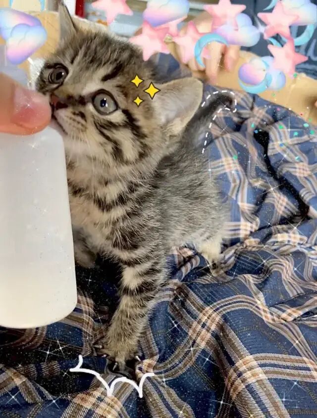 过去一看是一只特别特别小的狸花猫,大概就三四周大吧,同事觉得他太可怜了就领回家了!!取名“奶糖”